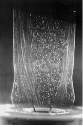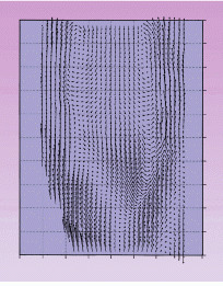 A pulse duplicator testbed that simulates the human heart cycle was used to examine the complex unsteady flow behind a bileaflet prosthetic heart valve (see photo on cover and p. 75). Cardiac output is simulated by a feedback-controlled piston-in-cylinder pump connected to the left heart ventricle, which consists of the aortic and the mitral test sections. Both sections are made from acrylic plastic, and a prosthetic heart valve is placed at the center of each. The contours of the vessels correspond to those of the average human heart.6 Measurement of the phase-averaged flow velocity is facilitated by a pulse generator coupled to the pump. The pulse generator produces an appropriate number of equally spaced pulses over a complete cardiac cycle so that flow images can be captured at specific times during one cycle. The unsteady velocity measurements are conducted in a tuned system, which is defined by the aortic pressure ratio, the flow rate, and the frequency.A typical particle image at a large opening angle of the aortic position shows how the flow separates at the leading edge of the lower leaflet because of the high angle of attack (see Fig. 1). A large separation zone can be seen below the center line and is characterized by a very small flow speed with high unsteady fluctuations. Classical shear instabilities--which periodically produce large-scale vortices--occur at the trailing edges of both leaflets and at the boundaries of the separation zones. These vortices decay further downstream into small-scale turbulence. The phase-averaged velocity vector field is characterized by numerous critical local flow patterns and clearly shows the large reverse flow in the center. In addition, the three-dimensional nature of the flow field can be seen from the low upstream flow rate caused by the flow reversal in the center, which itself results from the flow separation occurring at the leaflet.