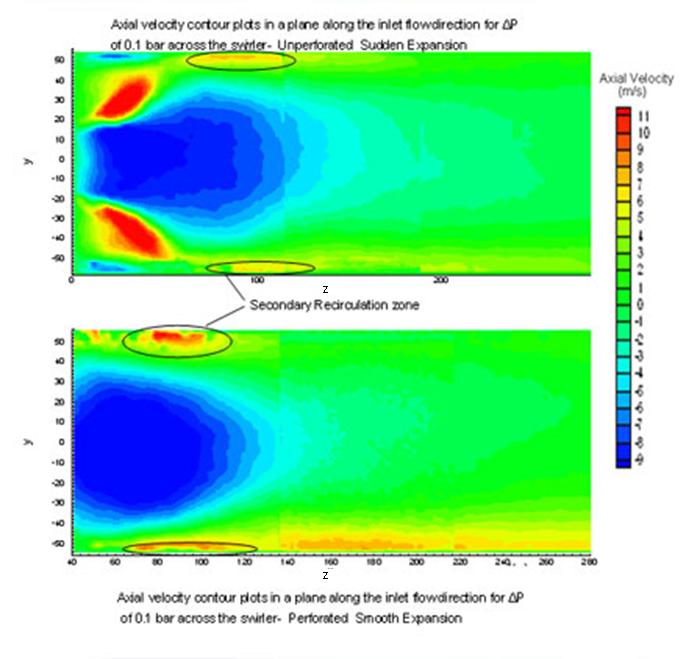 Two test conditions were analyzed; i.e., the pressure drop across the swirler is maintained as 0.1 bar and 0.05 bar. For unperforated sudden expansion case, the CTRZ has a jagged shape due to a highly non-uniform inlet velocity profile; however, for the unperforated smooth expansion case, the shape of the CTRZ is smoother. In the case of perforated flare, the holes in the flare also play an important role in making CTRZ further smoother than unperforated smooth expansion case. The flare leads to the generation of more vorticity patches and keeps them at the centre. The holes present on the flare were contributing to more vorticity patches at the centre than in the unperforated smooth expansion case. The vorticity patches are concentrated at the centre due to the confining effect of the secondary corner recirculation zone on the swirl flow. The width of the CTRZ was more for the perforated smooth expansion case as compared to the unperforated smooth and sudden expansion cases.