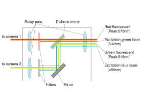 We developed multicolor confocal micro PIV system (Fig. 1), which can measure two different physical components of flow phenomena. This system consists of Confocal Micro PIV system, which is developed by Kinoshita et al.(2005), and multicolor optics. It uses two color lasers for illumination and records two different fluorescent lights. This system also enables precise color filteration among four wavelengths, using specific fluorescent particle or dye that has ideal wavelength characteristics for filteration (Fig. 2).