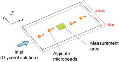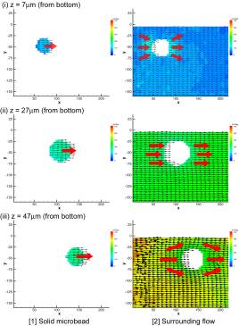 Figure 6 shows flow velocity distribution and movement of distributed particle inside the alginate microbeads. There is no hydrodynamic flow inside the microbeads due to their solidity. The fluorescent microshpere implanted in the microbeads were studied to measure to clarify the rotational motion of microbeads. Results show that the microsphere movement inside the microbeads at each height is almost uniform. Thus, it suggests that the microbead has high sphericity and rotates at a constant angular velocity.
